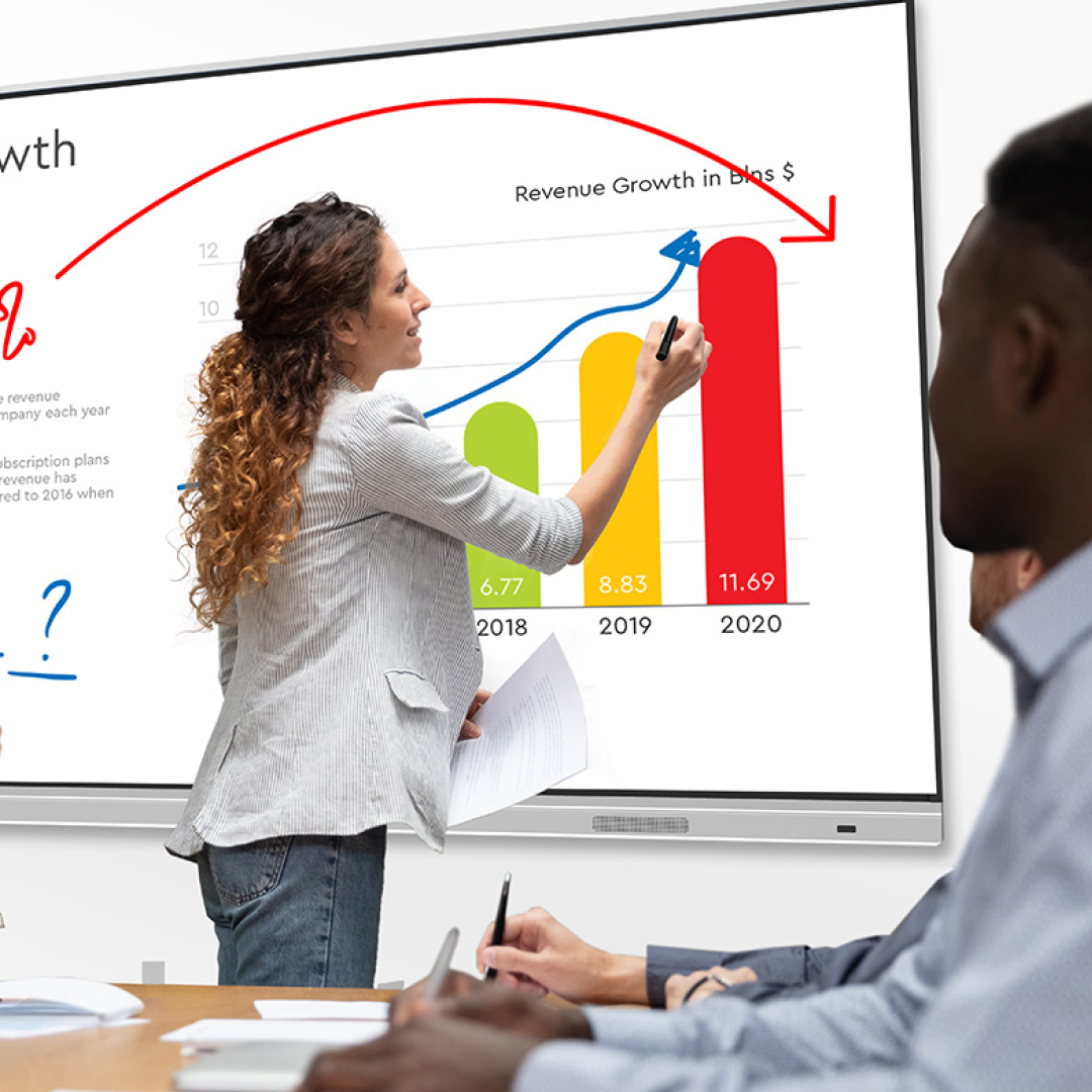 Das interaktive Touchdisplay macht ständige Folien- oder Beamer-Bildwechsel überflüssig und zieht die Aufmerksamkeit Ihres Publikums mit spannenden Features auf sich. Dank integrierter V-Sense-Touch-Technologie können Nutzer die gewünschten Informationen mit einem Fingertipp, einem Stift oder stiftähnlichen Objekten zügig und ohne lästige Unterbrechungen abrufen.